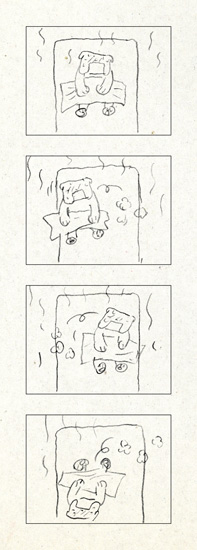 寝苦しい夜、 ふとんの冷たいところを探してます。 しまいには床まで移動。